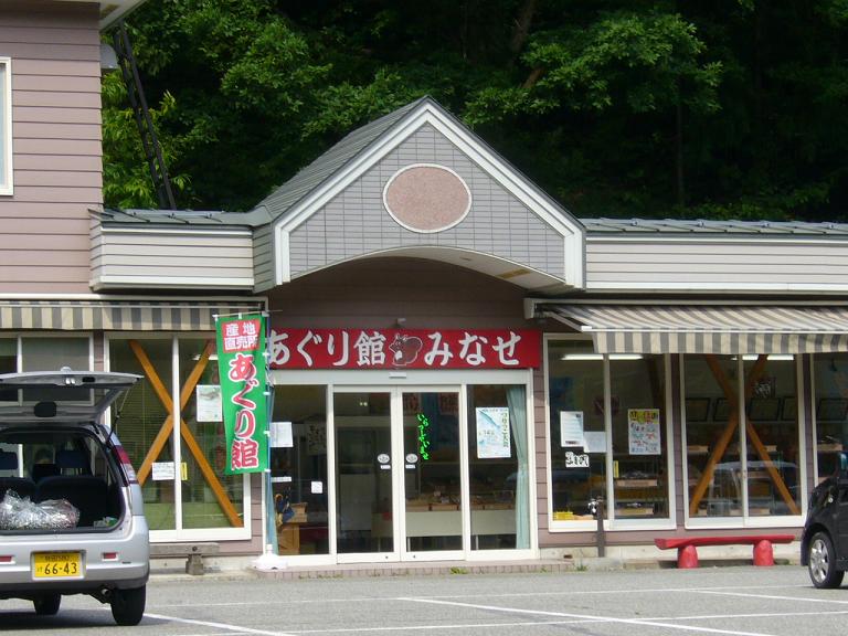大噴湯入り口駐車場には地元の特産品販売所もあります。中では農産品のほか、山菜の瓶詰め、切干大根などの乾物、地元のお母さん達手作りのお菓子などなど販売しています。同じ駐車場に観光物産館も並んでいます。大噴湯へ立ち寄った際に便利です。