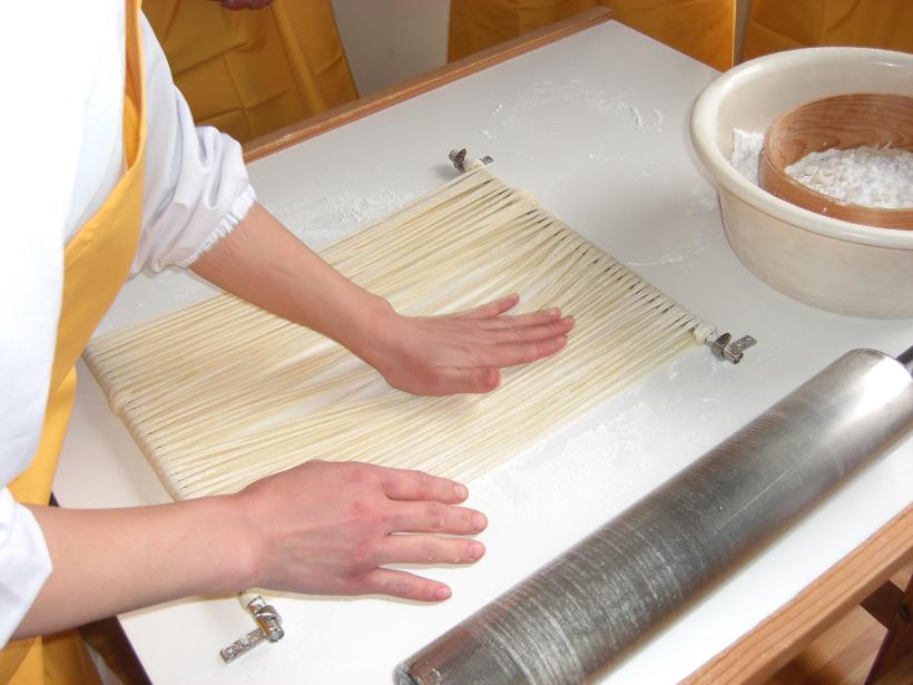 手本を示しながらうどんづくりはそう簡単にできるものではない事を教え、また体験を通して感じてもらいました。