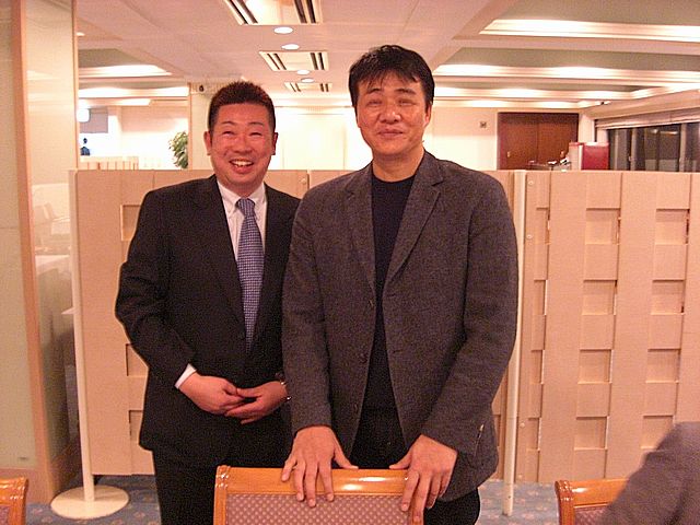 与田氏と一緒に並んでみました。私も小さいほうではないのですが見ての通りとても大きな方で、こんなにも肩幅の広い人は初めてです。