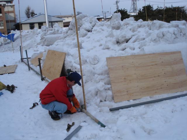 昨日は出来上がった型枠の中にひたすら雪を詰めて固めていく作業を行いました。