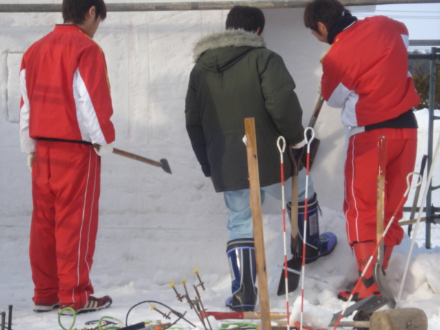 昨日は少し温かく、また、今日は雨の予報でしたので雪像が解けないようにやぐらを組み、ブルーシートで覆いました。
