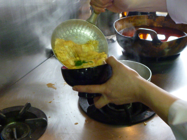 ランチ・ディナータイムともに人気の比内地鶏親子丼セットを調理している所です。