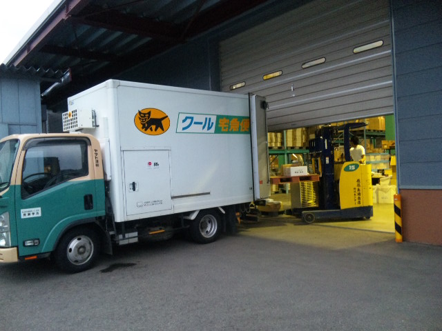 この時期、私たち同様、大変なのが運送業者さん。一日何百ケースもの商品をトラックで集配します。商品によって段ボールの大きさがまちまちなのでパズルのように無駄なく積み込んでいました。
