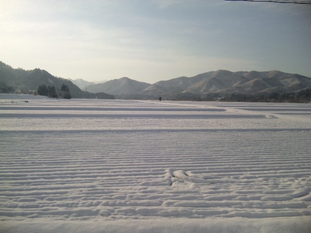 総本店周辺です。周り一面、真っ白く雪化粧しました。天気がいいと景色も一層映えまね、たんぼの波模様がとてもきれいでした。