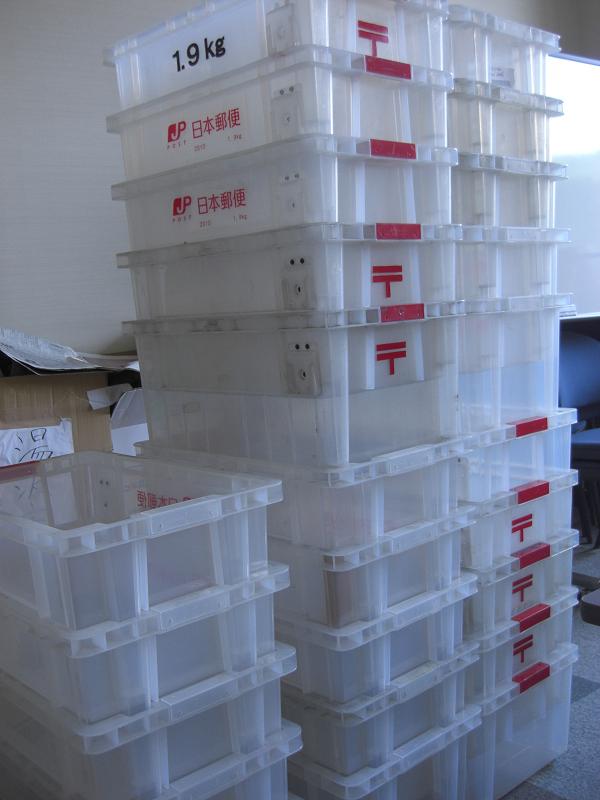郵便局から借りているこちらのコンテナボックスに詰めて発送準備中です。