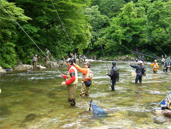 前日にはたくさんの大物ニジマスが放流されていますのでかなりの釣果が期待できそうです。また、子供達用に川原に特設されたいけすでイワナのつかみ捕りも行っておりますのでご家族で楽しめます。