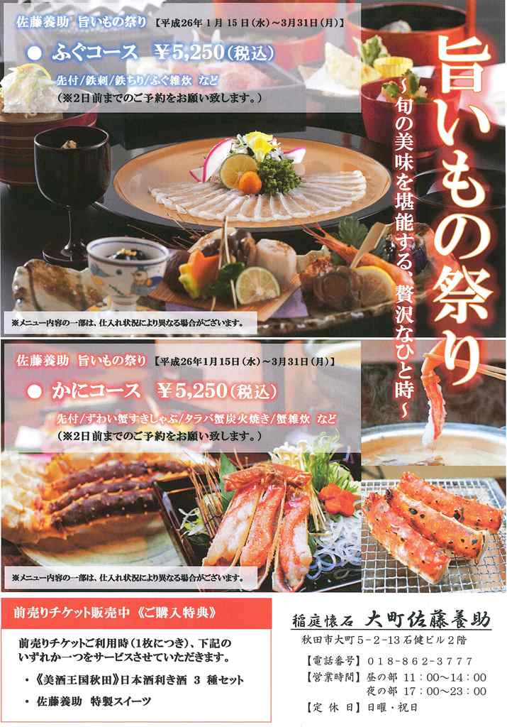 大町佐藤養助では、3/31(月)迄の期間を通して、【ふぐ祭り】【かに祭り】のお好きなコースをお選びいただけます。