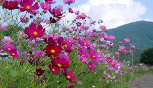 約1kmにわたってコスモスの種がまかれ、現在では植栽延長は14kmにおよび、約6万本が植え付けされてており、「コスモスライン」として観光客からも親しまれています。