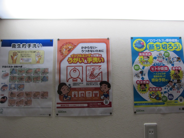 全部門で手洗い・うがい・手先の消毒を呼びかけ、風邪だけでなく、体調管理にも徹底しています。