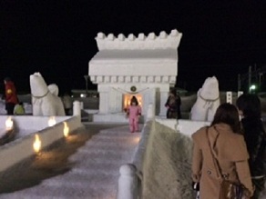 雪で作ったお堂や犬の雪像が雪国ならではの幻想的な世界をつくり出します。
