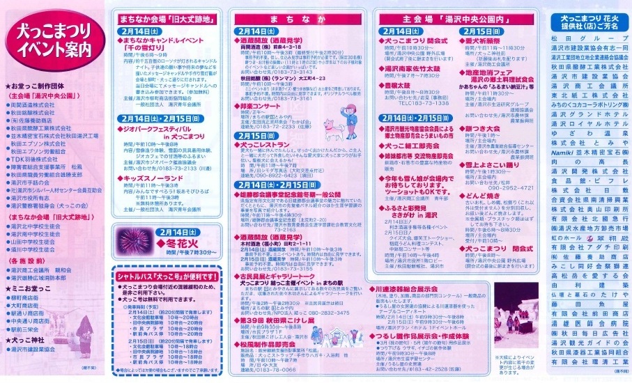 本日は冬花火や湯沢南家佐竹太鼓、明日は愛犬祈願祭や餅つき大会などが行われます。