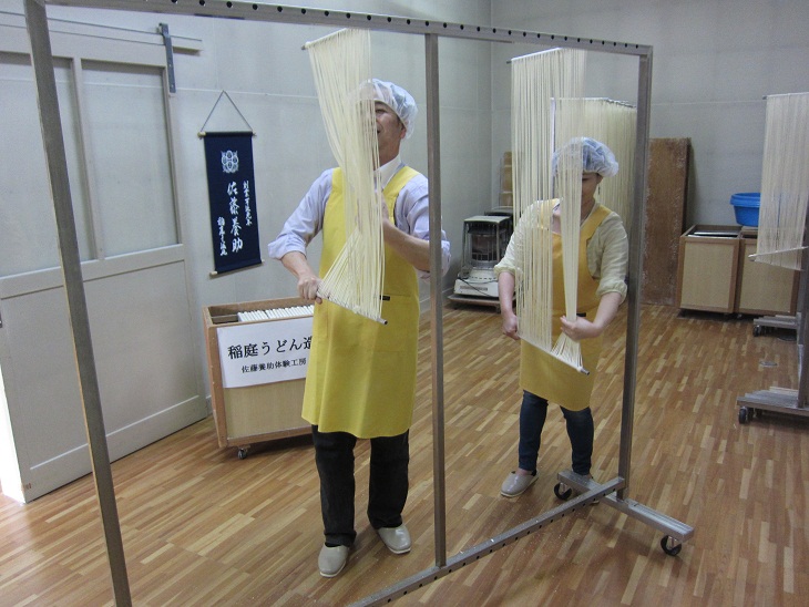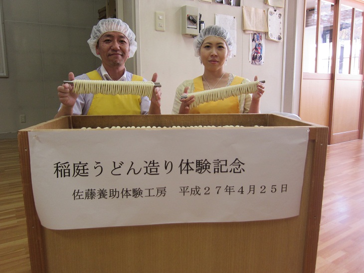 田口様は、結婚式で自分たちのつくった稲庭うどんを振る舞いたいと、体験工房をご利用され、記念に写真撮影をしながら作業を行いました。