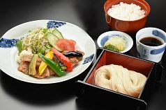秋田店のおすすめ「鳥海」は、オープンからある人気メニューのひとつで、桃豚ロース肉の生姜焼きとご飯と稲庭うどんのセットです。