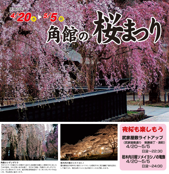 角館の武家屋敷は佐竹藩の城下町として有名で、通りには樹齢200年以上といわれる約400本の枝垂桜が咲き、262本が国の天然記念物に指定されています。