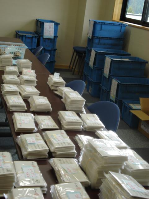 1通1通、手作業で準備をした後は郵便局からお借りしているコンテナへ。