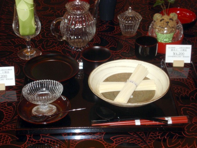 左右のお膳で色合いが異なる漆器を並べてあり、配膳の参考になります。