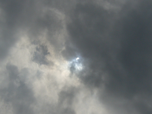 本日22日は日食が見えるはずの日外はあいにくの天候それでも東北方面で部分日食が見えるといわれた時間に外へ 一面の曇り空ながら、ところどころ雲の薄いところがあり、風で流れるのを粘って待ちました本来は直接見てはいけないとの事で鏡で反射させてみたのですが、やはり雲ごしの為、うっすらしか投影できませんでした