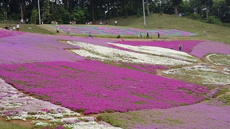 ツツジ、サクラの花の形を浮かび上がらせ、芝桜の丘に描かれる花のアートが見事です。