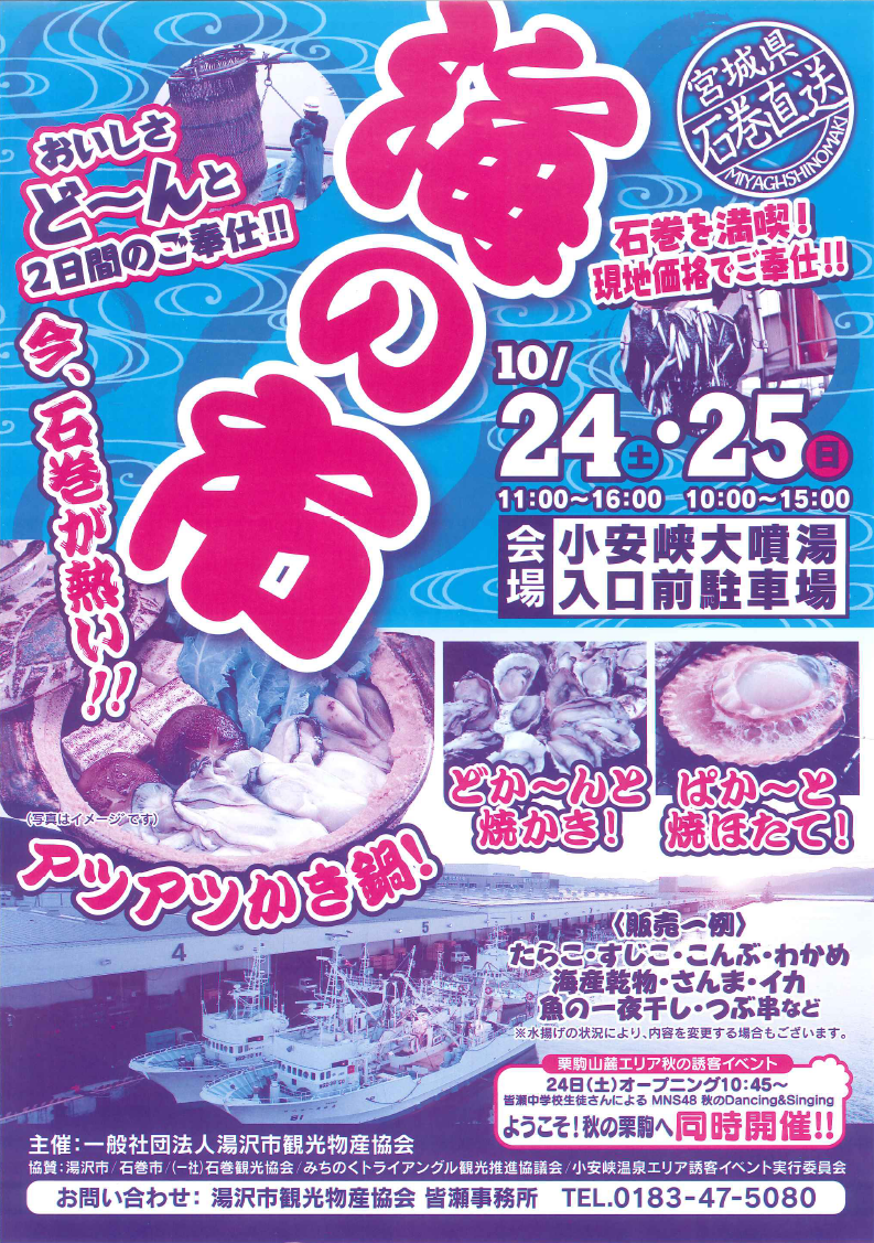 カキ鍋、ホタテ焼き、たらこ、わかめ、さんま、いかなどの宮城県石巻から直送の海産物をどど~んとご奉仕します。
