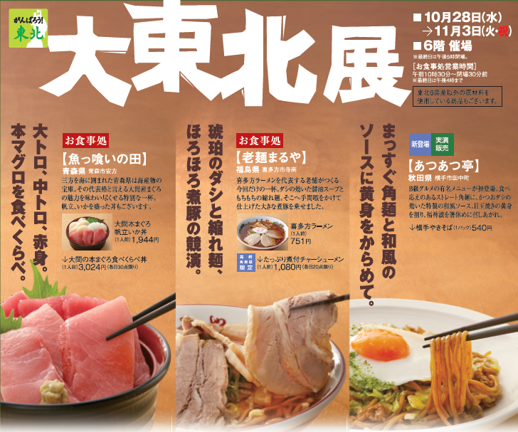 東北6県の自然の恵みや郷土の味などが勢揃い!「山海の幸」、「人の技」によるうまいものをご堪能くださいませ。