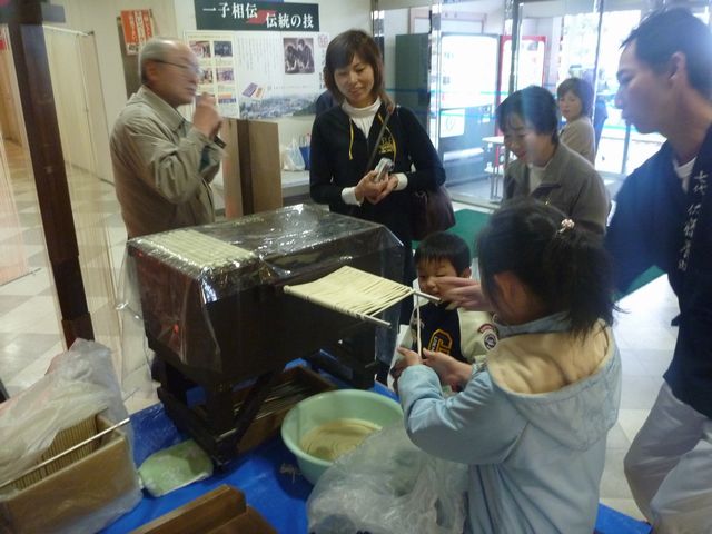 秋田を代表する稲庭うどん。実演・体験は食育の一環としてやっており、大人から子供まで稲庭うどんが出来るまでを興味深くご覧になっていました。