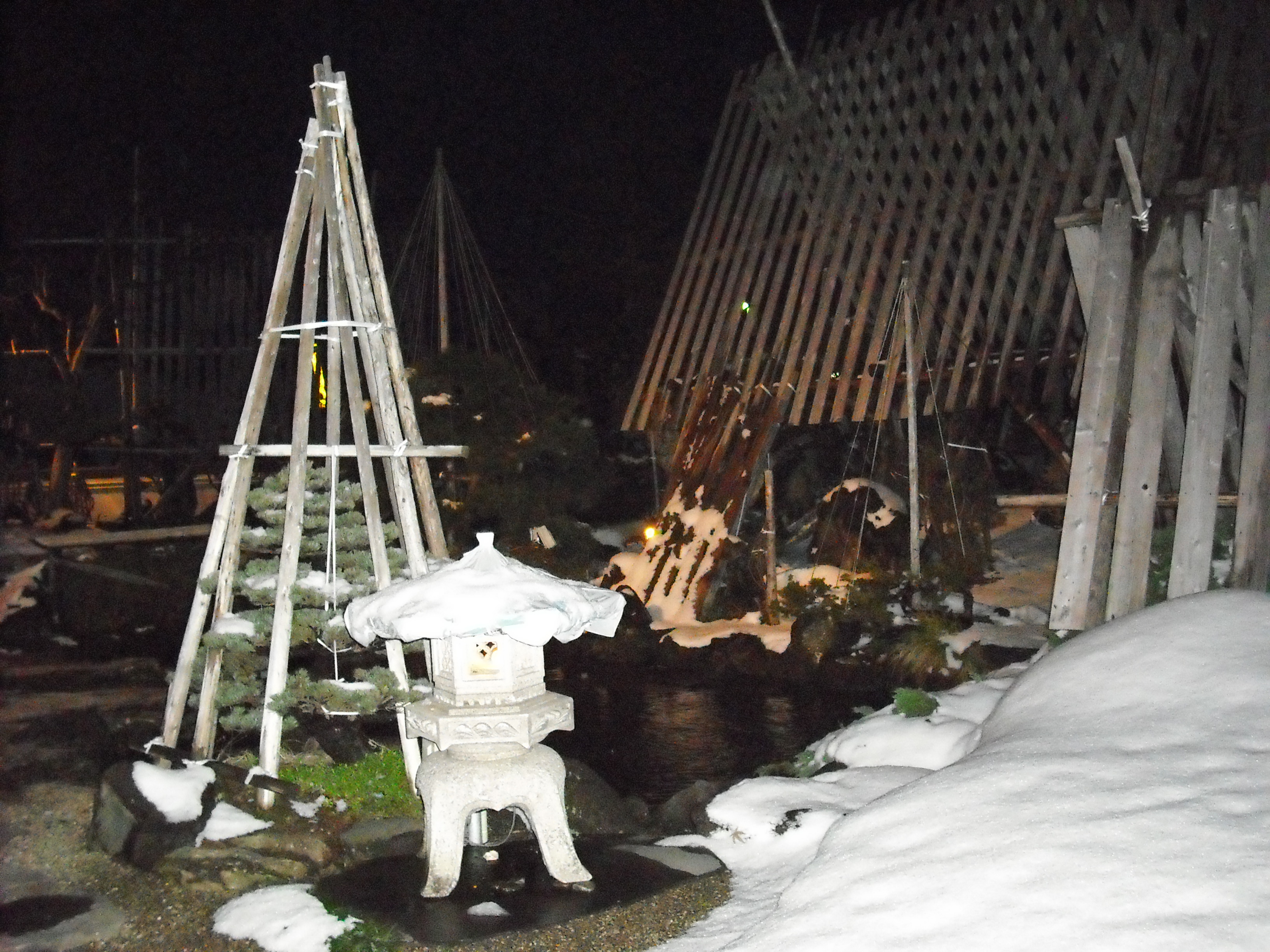 雪解けもだいぶすすみ、養心館の庭園にはばっけも芽を出し始めました。(秋田ではふきのとうの事をばっけといいます)夜の部ではライトアップの効果により、昼とはひと味違った雰囲気で、お客様にもお楽しみ頂いております。 特に庭に面した2つの部屋(壱の間、弐の間)からは雪見障子越しに食事を楽しみながら庭園をご覧頂くことができます。皆様お誘いあわせの上、ご来店ください。お待ちしております。